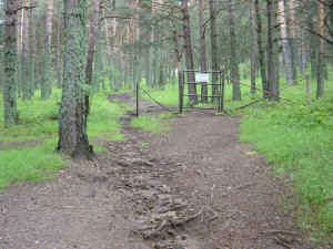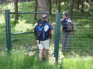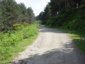 Cruzaremos la carretera con precaución y justo enfrente pasaremos por la cancela metálica de color verde, adentrándonos en el bosque y subiendo a trecho hacia la parte superior de la curva que describe la carretera, |