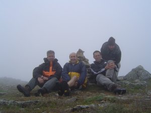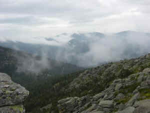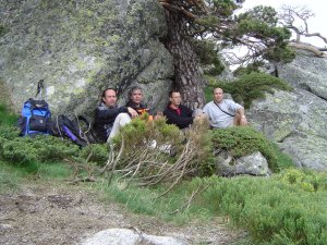 NUESTRAS ANÉCDOTAS: En esta ocasión compartimos senda: Manolo, Lucas, Ángel y Carlos. La ruta la realizamos el 7 de junio de 2004. Como es una ruta lineal, nos desplazamos con dos coches al Puerto de Guadarrama dejando uno allí estacionado en el aparcamiento del restaurante Alto del León y desplazándonos con el otro hasta el aparcamiento de Majavilán (Las Dehesas de Cercedilla). Manolo estuvo dudando durante toda la semana si nos acompañaba, pues el lunes anterior había estado en las Cinco Lagunas de Gredos con Ángel y habían pasado mucho calor; Y al ser está una ruta que prometía castigarnos mucho el sol, no terminaba de decidirse; Pero hubo suerte y el día amaneció nublado en la sierra y se decidió en el último momento a acompañarnos. Comenzamos a caminar a las 8:15 h. de la mañana con una temperatura de unos 14 grados, sin sol y con nubes altas, que nos permitieron una subida relativamente cómoda hasta el Collado de Marichiva, allí desayunamos un poco e hicimos un poco de tiempo a ver si aparecía nuestro amigo taimado "El famoso zorro de Marichiva" no hubo suerte, y continuamos la marcha hacia el Cerro de la Peña del Águila. Durante la ascensión las nubes comenzaron a perder altura, y desde el lado madrileño comenzaron a pasar el cordal sumiéndonos en una intensa niebla en múltiples ocasiones, que no nos permitía disfrutar de las impresionantes vistas de una forma continua. Pero a cambio nos permitía un cómodo caminar sin los agobios del calor y el pasar de las nubes daba al entorno un encanto especial. En la cima del Cerro de la Peña del Águila la niebla era muy intensa, estuvimos un buen rato esperando a ver si se disipaba para disfrutar de las vista y poder sacar alguna foto, pero fue inútil, el frío comenzó a ser intenso (Solo llevábamos una polar y un chubasquero) así que continuamos la marcha un poco apesadumbrados pues si el día continuaba así poco íbamos a ver. Pero hubo suerte de nuevo y cuando llegamos a la primera cima de la Peñota comenzaron de nuevo los claros y Lucas pudo disfrutar de las vistas que los demás ya habíamos visto en otras ocasiones. El paso de las cimas de la Peñota, nos impresiono a todos; Es un pequeño laberinto entre grandes bloques de piedra que cuando pasa por el lado madrileño esta acompañado de grandes cortados hacia el valle. Te hace sentir esa extraña sensación de altura y dificultad que una vez superada te llena de un agradable bien estar. Todos comentamos que este paso con nieve puede ser muy peligroso, además de difícil de superar, pues las marcas y pequeños hitos seguramente no serán visibles. En la bajada hacia el Collado de Gibraltar una vez pasada la tercera peñota encontramos un pequeño rincón (Una pequeña pradera de hierba adosada a una gran piedra y un pino coronándola) que formaba una especie de balcón hacia el Valle del Río Moros, unas vistas espectaculares. Hicimos una larga parada, pues el sitio invitaba a ello y nuestras caras de gozo impedían el que ninguno propusiera el continuar la marcha.