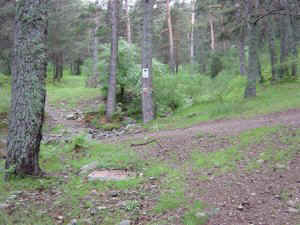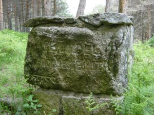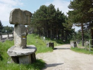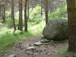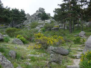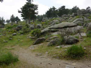 | En este punto podremos ver una piedra cincelada. Desde aquí si tomamos la pista hacia nuestra izquierda, nos dirigiríamos en un suave descenso a Cercedilla (6 Km.), nosotros tomaremos la pista hacia nuestra derecha, sin apenas desnivel iremos disfrutando de la frondosidad del pinar tapizado de helechos hasta alcanzar la Carretera Nacional VI, en la que un dolmen de piedra indica el comienzo de la ruta a la Peña del Arcipreste. |