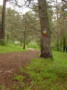 continuamos ascendiendo en paralelo al arroyo de Majavilán hasta entroncar con una nueva vereda marcada con puntos rojos y banda amarilla-blanca; Cogemos esta nueva vereda marcada por los puntos rojos hacia nuestra derecha ( Vereda del Poyal de la Garganta) la cual en continuos y exigentes repechos nos llevara arropados por el bosque al collado de Marichiva, |