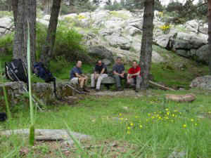 y con un sol luminoso disfrutamos del entorno de La Peña del Arcipreste de Hita (que Julio y Karlos habían disfrutado el fin de semana anterior, y en esta ocasión no nos acompañaron Julio por intervención quirúrgica y Karlos por trabajo ). Terminamos la ruta en el Puerto de Guadarrama a las 16:15 h., con mucho calor, pues las dos últimas horas el sol brillo con fuerza, tras un refresco en el restaurante recogimos el coche y nos desplazamos a Cercedilla a recoger el otro vehículo, una pequeña charla en las praderas de las Dehesas de Cercedilla y de nuevo para la inhóspita ciudad. |